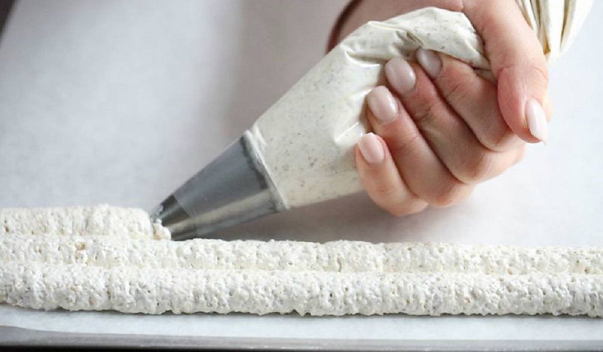 Nejprve připravte hmotu na pusinky. Za tímto účelem vyšlehejte bílky, dokud nebudou tuhé. Opatrně vmíchejte cukr, vanilkový cukr, mouku a nasekané lískové ořechy. Vložte směs na pusinky do cukrářského sáčku a vytlačte ji na proužky na plech vyložený pečicím papírem. Pásy by měly vytvořit obdélník. Pečte je po dobu 20 minut při teplotě 150 stupňů. Poté nechte vychladnout.