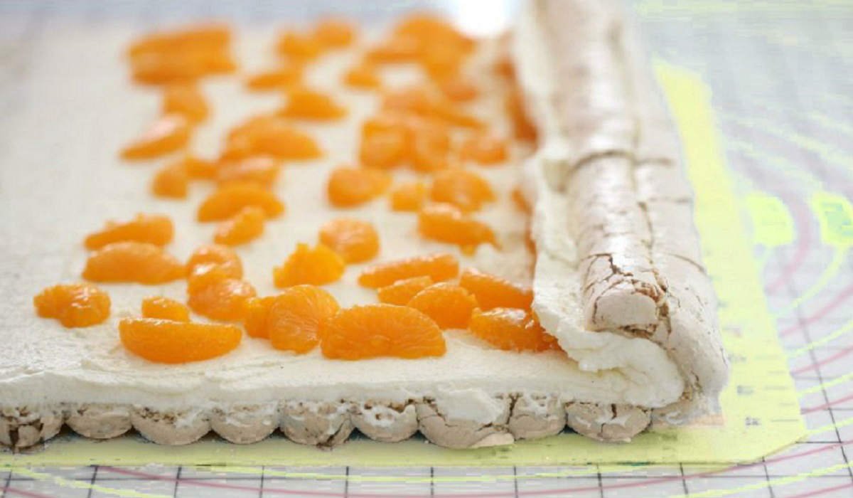 Vyšlehejte smetanu do krémového stavu a rozetřete ji na pusinku. Nahoru položte plátky mandarinek a rolku jemně stočte. Dejte pochoutku do chladničky po dobu alespoň 5 hodin.