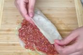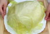 Ze zelného listu vždy odřežte žebro (pevný, světlejší střed listu) viz video a na jednu jeho polovinu naneste přiměřené množství náplně. Přimáčkněte druhou polovinou a postup opakujte, dokud vám nedojde náplň.