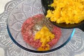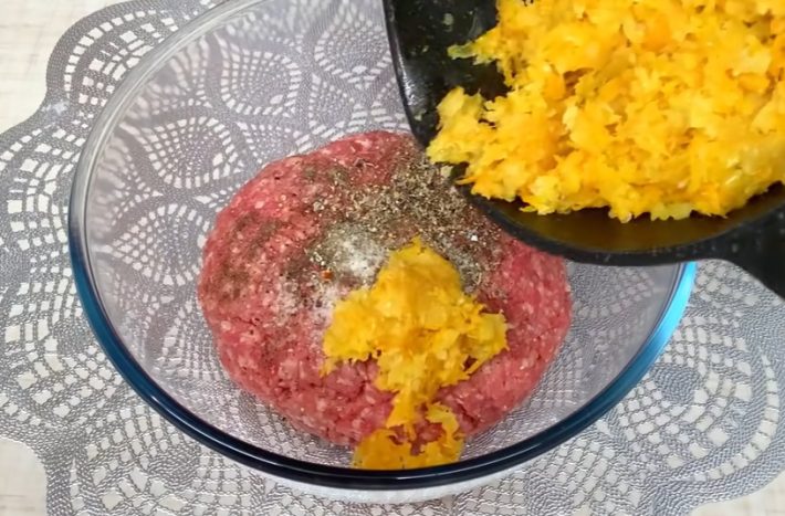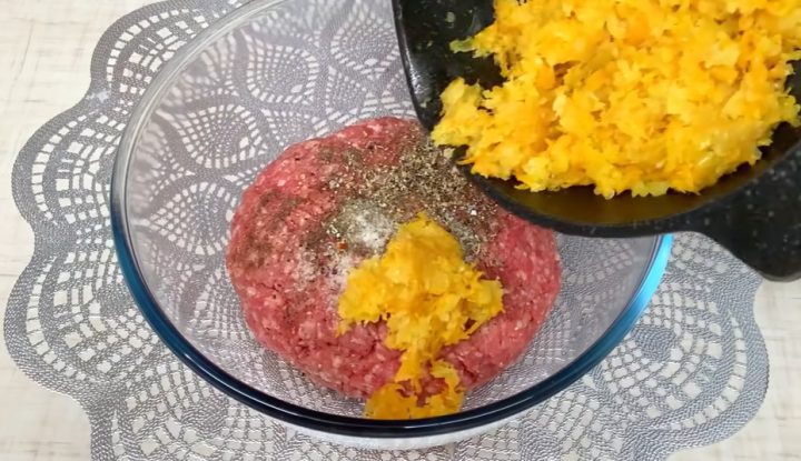 Na rozpáleném oleji orestujte cibulku a po chvíli k ní přihoďte i nastrouhanou mrkev. Maso dejte do hluboké mísy, osolte jej, opepřete a přidejte další koření dle vaší chuti. Dodejte k němu smaženou cibulku s mrkví a důkladně promíchejte.
