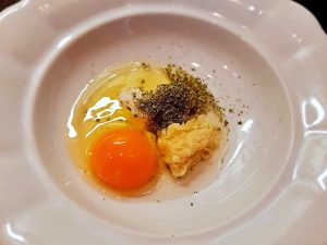 Do hlubokého talíře vyklepněte jedno vajíčko, přidejte prolisované stroužky česneku, sůl, majoránku, mletý černý pepř a asi lžičku sádla.