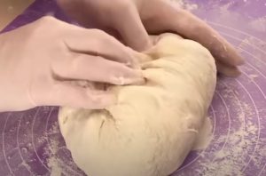 Rozehřejte troubu na 240 °C a dejte do ní rozehřát na 15 minut větší silnostěnný hrnec s poklicí, samozřejmě nesmíte použít nádobí s plastem. Těsto vyklopte na pomoučněný vál, roztáhněte a přeložte proti sobě strany na třetiny. Pak ho otočte o 90 stupňů a zase přeložte. To udělejte asi 4krát a pak z těsta vytvarujte kouli. Během tvarování těsto skládejte do jednoho místa, na které pak bochník položíte. Přikryjte fólií a nechte 15 minut kynout.
