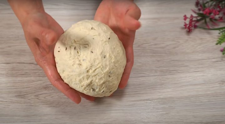 Teplou vodu smíchejte se dvěma lžičkami cukru a instantním droždím. Dobře promíchejte a prosejte ke směsi 400 gramů hladké mouky. Přidejte po jedné lžičce soli a kmínu a ručně zadělejte hutné a lepivé těsto.