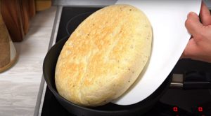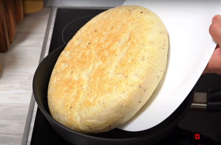 Velkou pánev se silným dnem vymažte olejem a vložte do ní připravené těsto, které prsty rozprostřete po celé ploše pánve. Zakryjte jej utěrkou a nechte ještě 30 minut stát. Pak položte pánev na sporák, zakryjte pokličkou a nechte na mírném žáru opékat dozlatova. Když se chléb sám od sebe odlepí ode dna, s pomocí talíře jej otočte na druhou stranu a nechte ji rovněž dopéct.