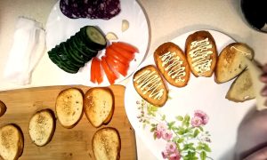 Okurku zbavte špičky a, stejně jako bagetu, ji nakrájejte na šikmé tenké plátky. Rajče nakrájejte na kolečka, která rozdělte na poloviny.