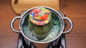 Dno velkého hrnce vyložte čistou utěrkou a postavte na ni sklenice s okurkami. Nalijte do hrnce tolik vody, aby její hladina dosahovala zhruba do dvou třetin výšky nádoby. Na kamnech pak vodu v hrnci přiveďte k varu a počkejte, dokud nezačne vřít i voda ve sklenici. Pokud to bude nutné, můžete ji dle potřeby doplnit vodou z hrnce. Jakmile voda ve sklenici začne bublat, vyjměte sklenice z hrnce a nechte je 5 minut zchladnout.