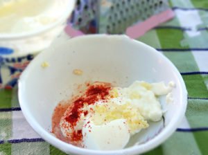 Pak vložte opět do mísy, zakápněte hustým bílým jogurtem, vložte prolisované česnekové stroužky a dle chuti opepřete, osolte a zasypte mletou červenou paprikou.