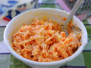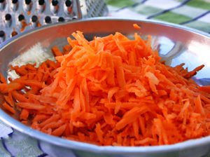 Začněte tím, že si mrkve oloupejte, omyjete je a následně nastrouháte nahrubo do větší mísy.