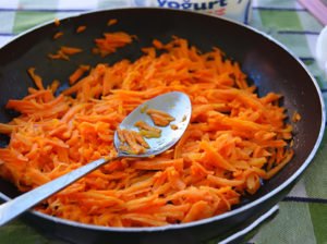 Nyní si v pánvi rozpalte rostlinný olej a orestujte na něm zlehka strouhanou mrkev ze všech stran.