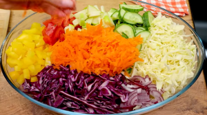 Hlávkové zelí zbavte svrchních listů a hlávku nakrouhejte na tenké nudličky, které podle potřeby rozpulte na kratší kousky. Oloupejte červenou cibuli, rozdělte ji na poloviny a ty pak rozkrájejte na tenké půlkulaté plátky, které přidejte do mísy k zelí. Nyní očistěte červené zelí a nakrouhejte ho stejným způsobem jako předtím bílé. Žlutou papriku rozkrojte, odstraňte stopku, jadřinec a semínka a dužninu nakrájejte na menší kostky. Rajče nakrájejte na silnější plátky a ty rozkrájejte na kostičky. Okurku podélně rozpulte a rozkrájejte na půlkulaté plátky. Jablko okrájejte z jadřince a nakrájejte na tenké hranolky. Mrkev nastrouhejte nahrubo a přihoďte ji do salátové mísy.