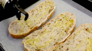 Nyní připravte bruschettu ve španělském stylu. Nakrájejte bagetu na tenčí plátky, položte je vedle sebe na plech pokrytý pečicím papírem a pokapejte je olivovým olejem. Vložte plech do trouby vyhřáté na 200 °C a pečte chléb 5 až 7 minut.