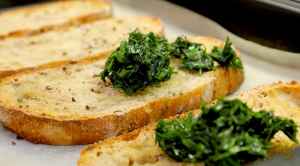 Mezitím nakrájejte čerstvý kopr a petrželku na jemno. Pokud nemáte rádi kopr, můžete použít jen petrželku. Vložte bylinky do misky, zakápněte dvěma lžícemi olivového oleje a přidejte prolisovaný či najemno nastrouhaný stroužek česneku. Osolte a opepřete a promíchejte na pastu. Na každý plátek pečeného chleba vložte jednu lžíci bylinkové pasty a rozetřete ji po celém povrchu. Na talíř naservírujte trochu zeleninového salátu, přidejte jeden plátek bylinkové bruschetty a s velkou chutí podávejte.
