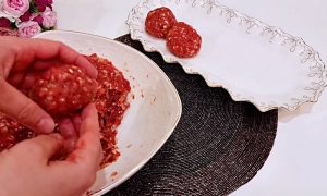 Mezitím si v míse smíchejte 500 gramů mletého masa se třemi jemně nasekanými cibulemi. Přidejte hrstičku uvařené rýže a zhruba po jedné čajové lžičky soli, pepře, sladké papriky a chilli, případně jiného oblíbeného koření. Přilijte dvě lžíce rajčatové šťávy a všechny ingredience důkladně propracujte do homogenní hmoty. Nakonec přilijte ještě 50 ml rostlinného oleje a směs ještě jednou promíchejte.