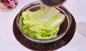 Hlávku čínského zelí zbavte poškozených okrajových listů a ostrým nožem odřízněte spodní košťál. Listy pak rozeberte od sebe, vyskládejte je do varné misky a přelijte je vroucí vodou tak, aby byly úplně ponořené. Takto je nechte máčet 10 minut, aby změkly a dalo se s nimi dále pracovat.