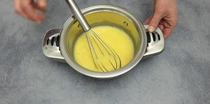 Začněte přípravou citrónového pudinku. Do hrnce vložte žloutky ze dvou vajíček, přidejte podle chuti cukr, jeden balíček (5 g) potravinářského škrobu, citronovou šťávu, citronovou kůru a půl sklenice vody (80 až 100 ml). Metličkou či vidličkou všechny ingredience velmi dobře promíchejte do jednolité konzistence.