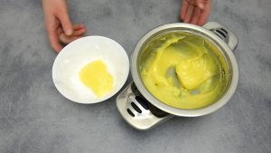 Kastrůlek pak postavte na kamna a na mírném ohni ho za pravidelného míchání zahřívejte až k varu a do zhoustnutí. Když směs získá konzistenci pudinku, odstavte ji z kamen a zašlehejte do něj 50 gramů másla. Ze získaného pudinku odeberte jednu polévkovou lžíci krému, kterou vložte do čisté mísy. Zbytek naplňte do zdobicího sáčku a na chvilku odložte stranou.