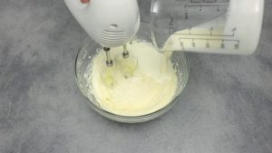 Do misky, kam jste odložili jednu lžíci citrónového pudinku, vyklopte 150 gramů mascarpone a přidejte trochu moučkového cukru. Elektrickým šlehačem rozmixujte smetanový sýr do hladké konzistence spolu s lžící citrónového krému. Výsledkem tak bude žlutavá nadýchaná hmota. Za stálého šlehání pak do směsi postupně přilévejte tekutou smetanu ke šlehání a vše zpracujte do tuhé a jednolité hmoty. Tu pak přemístěte do zdobicího sáčku.
