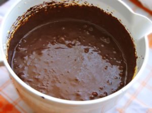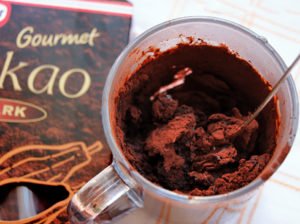 Nejprve si v misce rozmíchejte kakaový prášek spolu s vroucí vodou a rozpustnou kávou. Poté vše nařeďte dalšími 60 mililitry vody, aby byla směs tekutější.