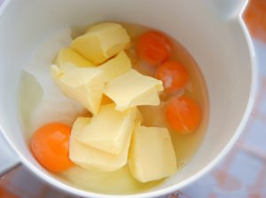 Dále si v jiné míse vyšlehejte vejce spolu s krupicovým cukrem a změklým máslem do nadýchané pěny.