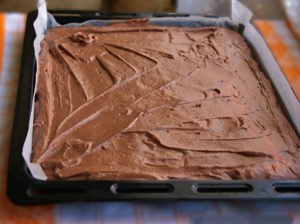 Nyní si k ruce vezměte dva plechy vystlané pečícím papírem a rovnoměrně na ně rozprostřete čokoládové těsto.