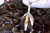Abyste zjistili, zda má směs tu správnou konzistenci, namočte do ní lžíci a v ulpívající čokoládové vrstvě prstem nakreslete čáru. Pokud je směs hustá, můžete směs odstavit ze sporáku.