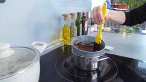 Hořkou čokoládu nalámejte na malé kousky do misky, kterou postavte do vodní lázně a zahřívejte ji tak dlouho, dokud se čokoláda úplně nerozpustí. Promíchejte ji a nechte 5 až 10 minut zchladnout. Nemusíte mít strach, znovu neztuhne.