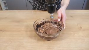 Do misky mixéru vložte tvaroh, přidejte cukr a vanilkovou esenci a mixujte nejvyšší rychlostí, dokud nezískáte hladkou, nadýchanou a homogenní směs. Tu vložte do hluboké mísy, přidejte k ní smetanový sýr a rozpuštěnou čokoládu a elektrickým šlehačem šlehejte, dokud nezískáte jednolitou a hladkou kompozici.