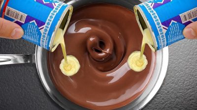 Po půl hodině teplo znovu zapněte a mléko přiveďte k varu. Horké mléko sceďte do misky s tmavou čokoládou, kterou v něm rozpusťte. V samostatné misce vyšlehejte smetanu s cukrem a poté do ní přidejte rozpuštěnou čokoládu.
