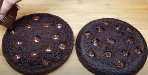 Pečicím papírem vyložte dno kulaté dortové formy a vlijte do ní připravené tmavé těsto. Pokud je třeba, rozetřete ho do roviny a vložte do trouby vyhřáté na 180 °C péct okolo 45 až 50 minut. Zda je dort dost propečený, zkontrolujte zapíchnutou špejlí. Pokud na ní neulpívá těsto a je suchá, můžete korpus vytáhnout z trouby. Nechte ho 15 minut vychladnout, tenkým nožem oddělte těsto od stěn formy a přeneste ho na mřížku. Tam ho nechte úplně vychladnout. Pak ho zabalte do přilnavé fólie a dejte do lednice alespoň na 2 hodiny či lépe přes noc.