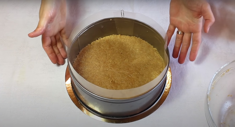 Připravte si kulatou dortovou formu, případně jen odnímatelné bočnice, které položte na vhodný tác, který pro jistotu vyložte pečicím papírem nebo fólií a vtlačte do formy sušenkovou hmotu tak, abyste vytvořili tenký plát korpusu dortu. Jeho povrch co nejvíce vyrovnejte do hladké roviny a vložte jej i s formou na pár minut do lednice, aby hmota ztvrdla.