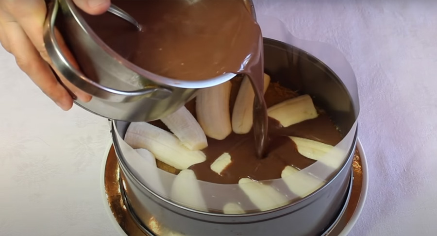 Oloupejte banány, podélně je rozkrojte a pak ještě na poloviny a vyskládejte je na vychlazený korpus. Pak banánovou vrstvu zalijte čokoládovým krémem a velmi dobře jej uhlaďte do roviny.
