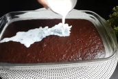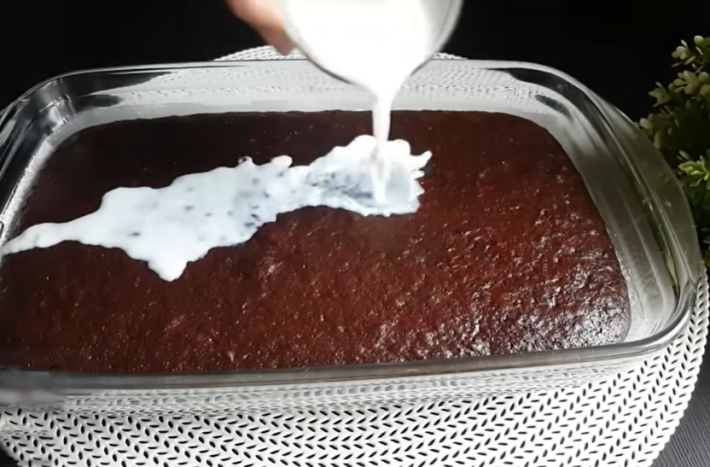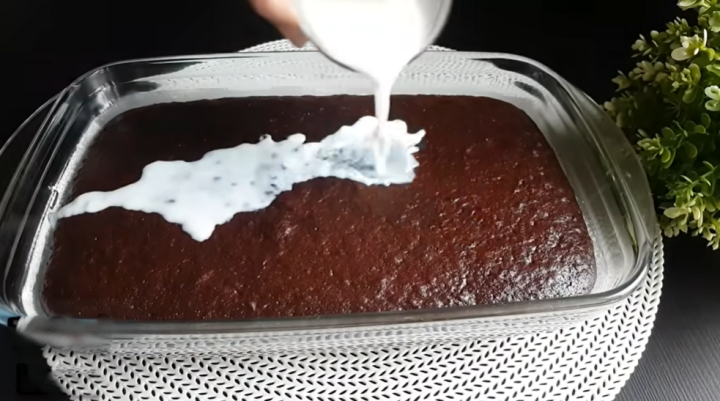 To vlijte do pekáčku vymazaného máslem a vysypaného moukou a rovnoměrně ho uhlaďte do roviny. Pekáč s těstem vložte do trouby rozehřáté na teplotu 180 °C péct po dobu 25 minut. Po dopečení nechte těsto vychladnout a zalijte ho 100 mililitry mléka.