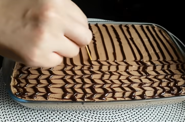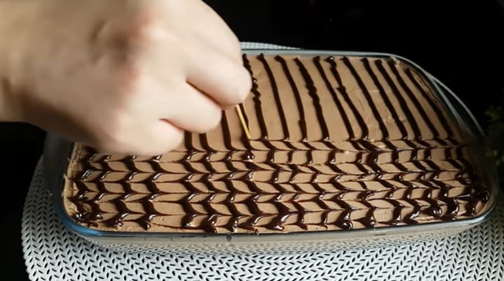 Čokoládovou šlehačku navršte na mlékem napuštěné těsto a urovnejte ji stěrkou. Ze zdobicího sáčku pak vytlačte na povrch příčné čáry, které přejeďte křížem párátkem, čímž vytvoříte ozdobné vroubkování. Hotový dort vložte alespoň na 1 hodinu do lednice, pak ho nakrájejte na porce a podávejte se šálkem voňavého čaje nebo kávy.