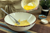 Připravte si hlubokou mísu a zralý banán. Banán oloupejte, nalámejte na kousky a vložte do mísy. Vidličkou banán rozmačkejte, dokud nezískáte jemnou, hladkou konzistenci. Do jiné misky rozklepněte vejce a metličkou ho rozšlehejte, dokud se žloutek s bílkem nespojí dohromady. Poté nalijte rozšlehané vejce k rozmačkanému banánu.