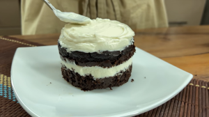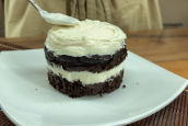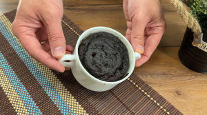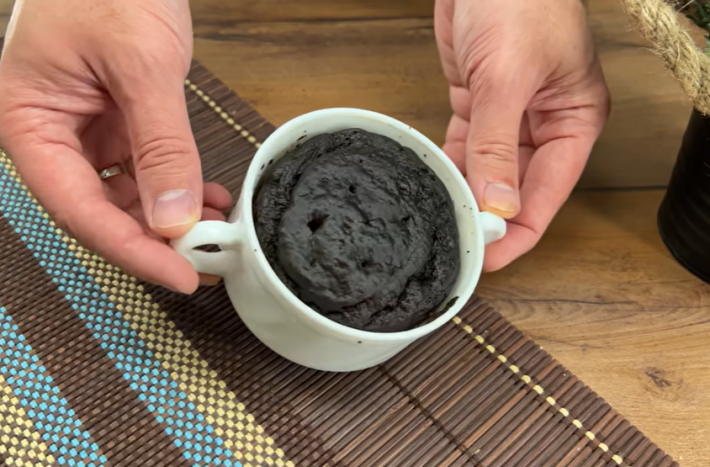 Formu na pečení nebo široký hrnek o průměru 9 cm vymažte olejem a nalijte do něj připravené těsto. Vložte do trouby předehřáté na 180 stupňů a pečte po dobu 25 minut. Párátkem vyzkoušejte, jestli je těsto hotové a ve formě nechte dezert zcela vychladnout na pokojovou teplotu. Mezitím si můžete připravit lahodný, jemný krém.