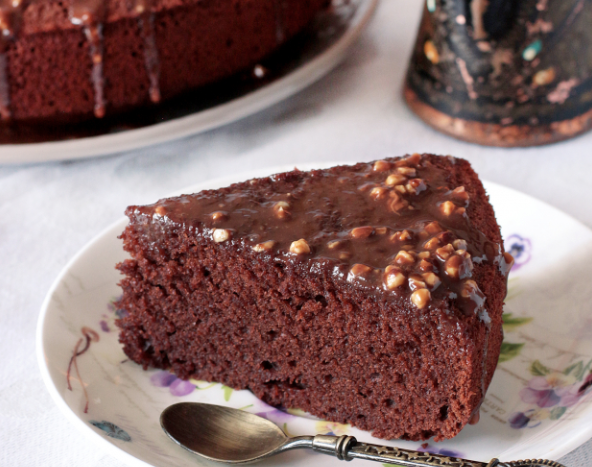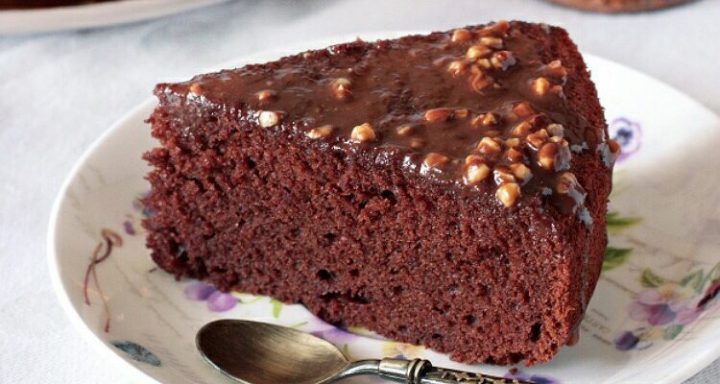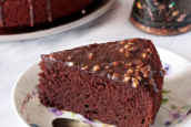 Na konci zkontrolujte špejlí, jestli už je dort hotový. Nechte ho vychladnout ve formě, poté jej ozdobte čokoládovou polevou a nasekanými ořechy.
