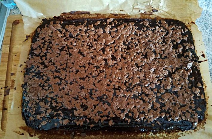 Vzniklé těsto vlijte na plech vyložený pečicím papírem, urovnejte ho do roviny a vložte do trouby rozehřáté na teplotu 180 °C péct asi 20 až 30 minut, podle vlastností vaší trouby (propečení zkontrolujte zapíchnutou špejlí).