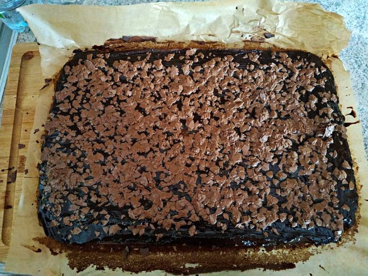 Po dopečení potřete povrch ještě horkého koláče rumem, aby byl vláčný. Ve vodní lázni rozpusťte na kousky nalámanou čokoládu a vmíchejte do ní kapku rumu. Touto polevou potřete celý povrch koláče, ozdobte ho čokoládovou posypkou (případně jinak dle své fantazie a chuti), nechte buchtu vychladnout a podávejte.