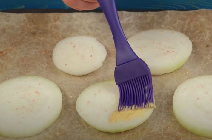 Cibuli nakrájejte na velké kroužky a dejte je na plech vyložený pečicím papírem. Osolte je, potřete lehce hořčicí a dochuťte tymiánem nebo jinými bylinkami dle vaší fantazie.