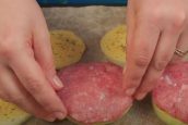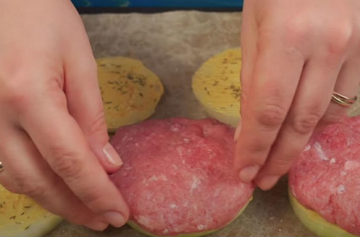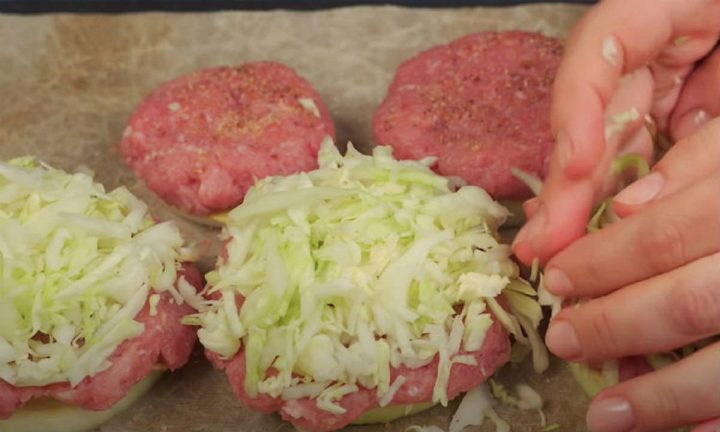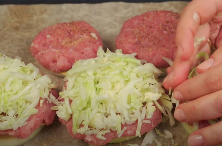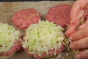 Mleté maso lehce dochuťte solí a pepřem a naneste jej jako další vrstvu na kolečka cibule.