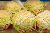 Jako další vrstva přijde najemno nasekané bílé zelí. Je nejlepší nasekat jej v robotovi, podaří se vám dosáhnout větší jemnosti a se zelím se bude snadněji pracovat. Cuketu nakrájejte na tenké plátky a položte je na zelí.