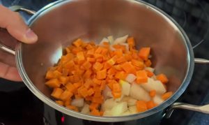Nalijte do hrnce dostatečné množství rostlinného oleje. Cibuli oloupejte, nakrájejte nadrobno a dejte ji do hrnce. Z mrkve odkrojte konce, ale neloupejte ji, a rovněž ji nakrájejte na kostičky. Přidejte ji k cibuli, dejte hrnec na sporák a začněte obojí smažit. Odřízněte z cuket konce a nakrájejte je na kostičky, poté je dejte smažit do hrnce k mrkvi a cibuli.