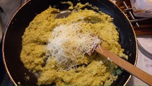 Nakrájejte najemno cibuli a osmahněte ji na másle. Oloupejte cuketu a zbavte ji jader. Pak ji nastrouhejte na struhadle a dobře vyždímejte. Pokud ji drobně posolíte, pustí ještě více vody. Přidejte cuketu na cibuli a spolu s prolisovaným nebo nastrouhaným česnekem poduste. Když se vše hezky spojí, odstavte směs z planeme a přidejte sýr. Lze použít tavený nebo nastrouhaný tvrdší sýr. Dle chuti osolte.