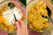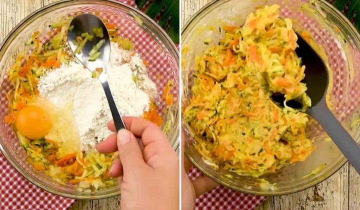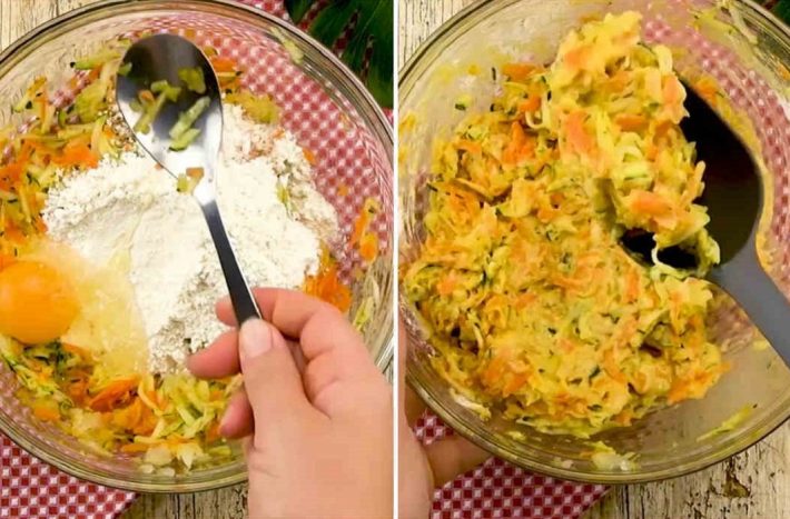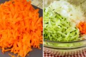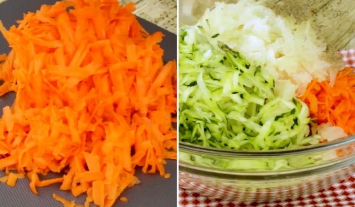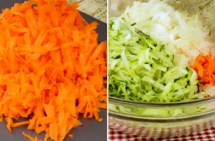 Nejprve si na hrubém struhadle nakrouhejte do velké mísy oloupanou mrkev a také omytou a očištěnou cuketu a cibuli. Přebytečnou šťávu odlijte.