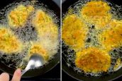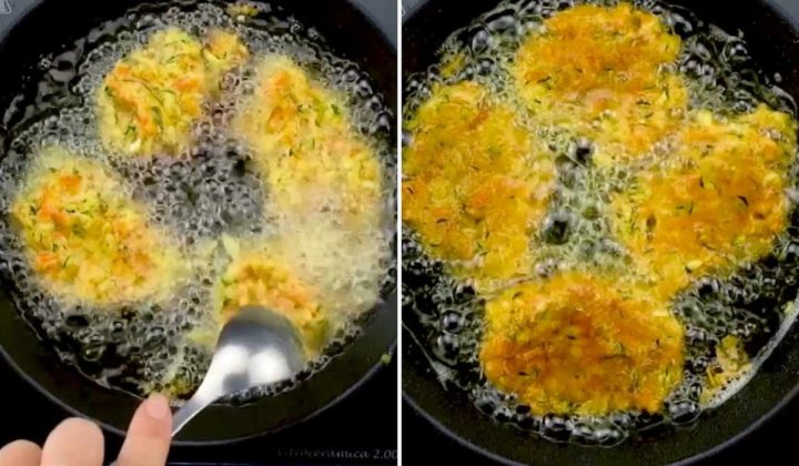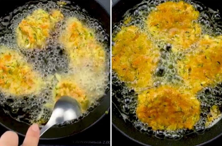 Následně si v pánvi rozpalte slunečnicový olej a do něj pomocí lžíce vkládejte přiměřené množství těsta, abyste vytvořili čtyři malé placičky. Ty smažte z obou stran dozlatova. Takto spotřebujte celé těsto.