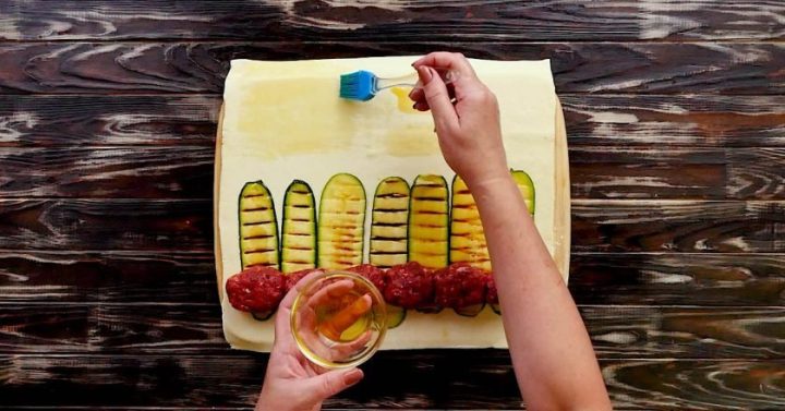 Cuketu umyjte a osušte a nakrájejte ji na tenké plátky. Na kamnech rozehřejte pánev s trochou oleje a všechny plátky cukety osmahněte dozlatova z obou stran. Listové těsto rozložte na pracovní plochu a celou jeho spodní polovinu těsta vyložte osmaženými cuketovými plátky.