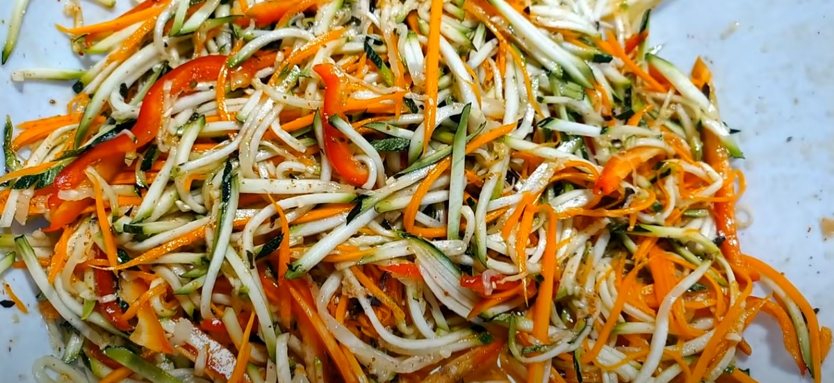 Z těchto surovin získáte 3 sklenice po 500 ml. Cuketu nakrájejte na velmi tenké proužky nebo nastrouhejte struhadlem, které udělá dlouhé tenké proužky. Stejně postupujte také s mrkví. Papriky také nakrájejte na dlouhé proužky. Bazalku posekejte. Vše vložte do hluboké mísy a dochuťte solí, cukrem a octem. Přidejte ostatní koření a prolisovaný česnek.