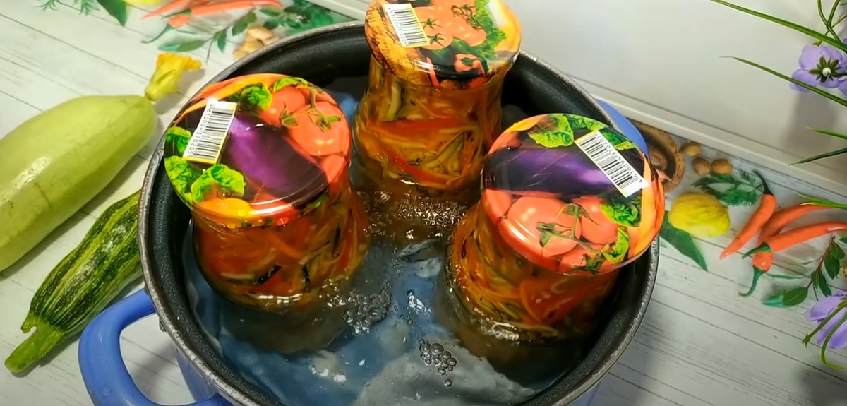 Poté dejte salát do sterilizovaných sklenic a přitlačte ho, aby se do každé sklenice vešlo co nejvíce zeleniny. Přidejte marinádu, aby byly sklenice zcela naplněné.