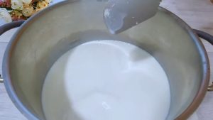 Smetanu nalijte do rendlíku, přidejte tři vrchovaté polévkové lžíce cukru a jednu čajovou lžičku soli, velmi dobře všechny ingredience promíchejte a na mírném ohni přiveďte k varu.