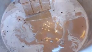Mezitím nasypejte do malé skleničky dvě polévkové lžíce kakaa, přilijte k němu půl šálku (asi 100 ml) smetany a míchejte, dokud nezískáte hladkou a lesklou hmotu, kterou přilijte do směsi v hrnci na kamnech. Za stálého míchání vařte směs tak dlouho, dokud nezískáte homogenní hmotu, kterou přiveďte k varu. Jakmile začne bublat, přidejte čokoládu, kterou buďto předem nastrouhejte, nalámejte na kousky, anebo ji přidejte celou (čím větší kusy čokolády do mléčné směsi přidáte, tím delší dobu bude trvat, než se rozpustí). Směs s čokoládou poté velmi dobře promíchejte.